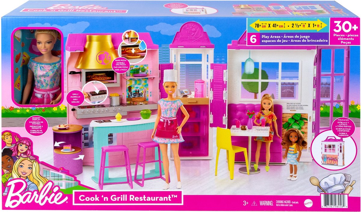 Jonge fijnproevers kunnen allerlei verhaaltjes opdienen met de Barbie Koken en Grillen Restaurant pop en speelset! Deze set is op een café geïnspireerd en biedt eindeloos veel speelplezier dankzij het kleurrijke en moderne ontwerp, de 6 speelplekken en de meer dan 30 accessoires. Barbie is klaar voor een nieuwe werkdag in een jurk, een schattig roze schort en een koksmuts. Kinderen kunnen haar helpen bestellingen op te nemen bij het bestelraam of maximaal 4 gasten naar een tafel begeleiden bij de bar of in de zithoek. Vervolgens kunnen ze in de keuken hamburgers op de draaiende grill bakken, zoete lekkernijen op de draaiende dessertplaat leggen, een pizza in de oven gooien en kijken hoe deze van kleur verandert tijdens het 'bakken'! Kinderen vanaf 3 jaar kunnen hun favoriete Barbie verhalen naspelen als kok, ober en klant, dankzij de meer dan 30 accessoires en eindeloos veel speelopties! Pop kan niet los staan. Afwijkende kleuren en versieringen mogelijk.
