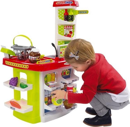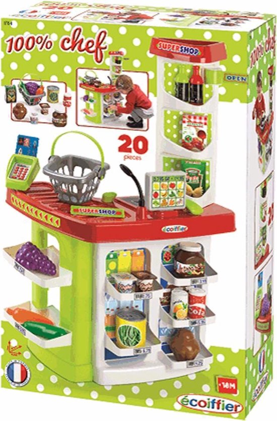 Run nu je eigen super markt met deze 20-delige winkel van Ecoiffier 100% chef! Boodschappen doen was nog nooit zo leuk. Richt de vakken in en kies uit wat je wilt 'kopen'. Stop de producten in het winkelmandje en als je alles hebt wat je wilt hebben zet je het mandje neer. De kassamedewerker weegt de groente en het fruit en zegt daarna hoeveel je moet betalen. Als er een probleem is roept ze gewoon nog een medewerker naar de kassa, met de microfoon. Nu kun je betalen. Stop de pinpas in de kassa. 'Fijne dag nog en tot ziens!'zegt de kassamedewerker zodra je betaald hebt.