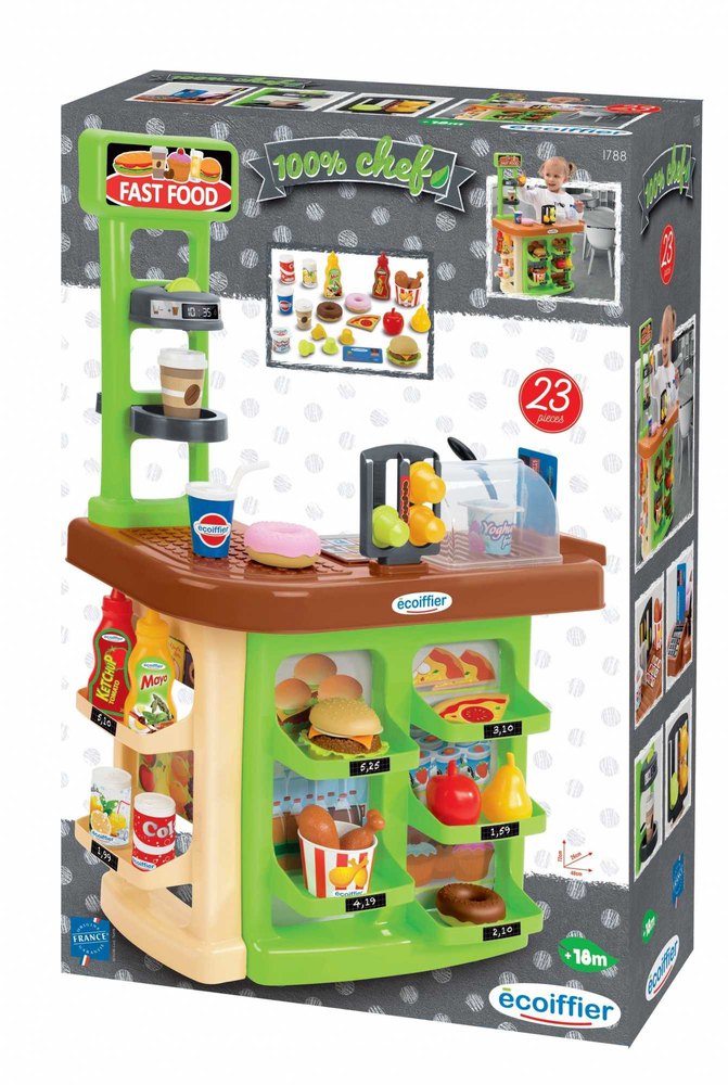 Zin om even lekker te snacken? Breng een bezoekje aan deze zelfbedienings fast food kraam. Een breed assortiment aan lekkernijen, zoals o.a.: donuts, een hamburger, frisdrank, koffie, pizza en fruit. Betaling per creditcard wordt geaccepteerd, dankzij de handige betaalterminal aan de zijkant van de kraam. Incl. stickervel. Ecoiffier staat bekend om zijn moderne ontwerpen en kleuren die rechtstreeks zijn beïnvloed door de nieuwste trends. Het kleurrijke speelgoed spreekt tot de verbeelding van kinderen en stimuleert de motorische en sociale vaardigheden. Alle producten van Ecoiffier worden geproduceerd in Frankrijk en zijn van hoogwaardige kwaliteit
