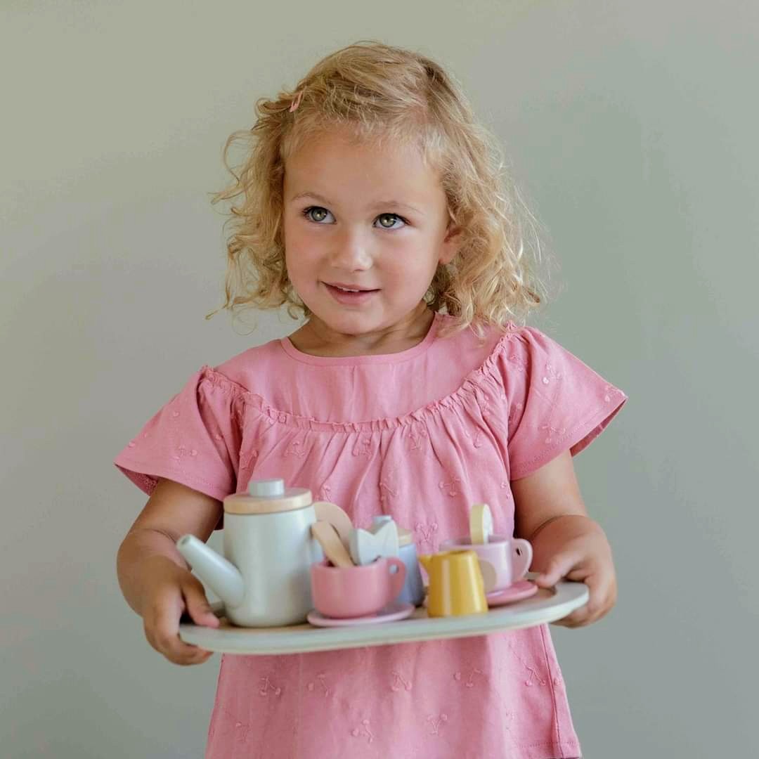Het schattige Little Dutch Houten Theeservies bestaat uit de volgende onderdelen: een theepotje, melk-kannetje, suikerpotje, citroenblad, muntblaadje, 2 x kop & schotel + lepel en een dienblad. Thee drinken met je vriendjes en vriendinnetjes was nog nooit zo leuk!