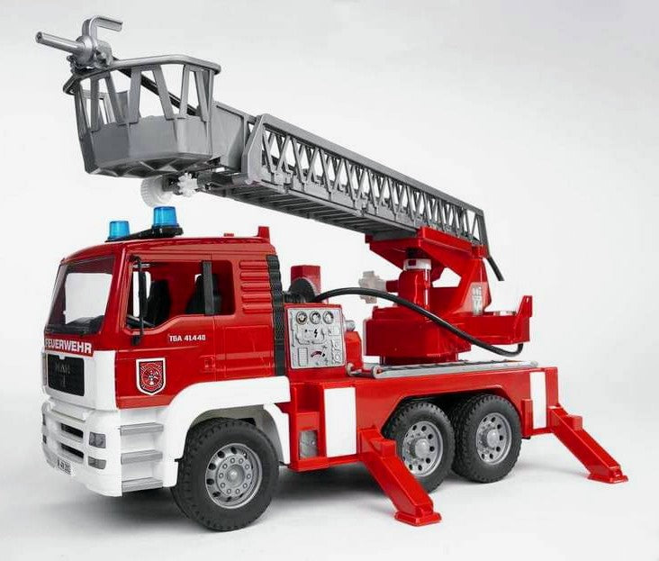 Red je stad uit de brand met de MAN brandweerwagen met draaibare ladder, waterpomp en licht- en geluidsmodule van Bruder! De wagen heeft steunpoten voor extra stabiliteit en je kan de cabine naar voren klappen om het detailrijke motorblok te bewonderen. De zijspiegel is inklapbaar. De ladder kan draaien, is uitschuifbaar met de draaiknop en je kan de hoogte aanpassen. Aan het eind zit een korf waarin plek is voor een bworld figuur. De waterslang is uitrolbaar. Vul de tank met water om de watersproeier op het eind echt te gebruiken! Met de licht- en geluidsmodule wordt het spelen nog leuker: er zitten maar liefst drie sirenegeluiden op en een motorgeluid! Na 20 seconden schakelt het geluid automatisch uit, of je kan herhaaldelijk op dezelfde knop drukken om het geluid eerder te laten stoppen. De brandweerwagen heeft profielbanden.