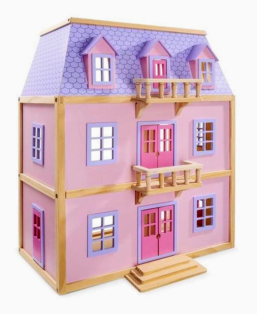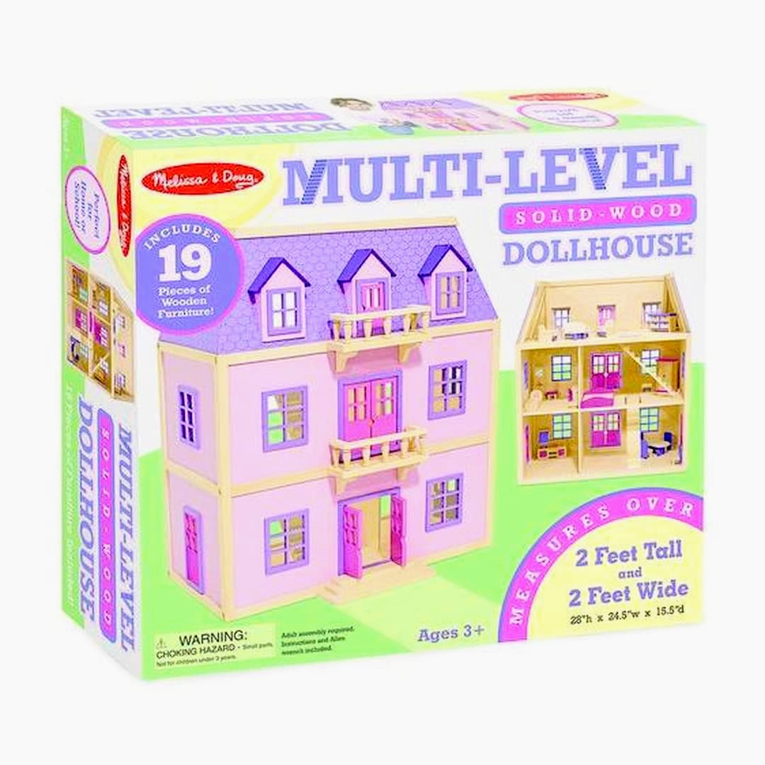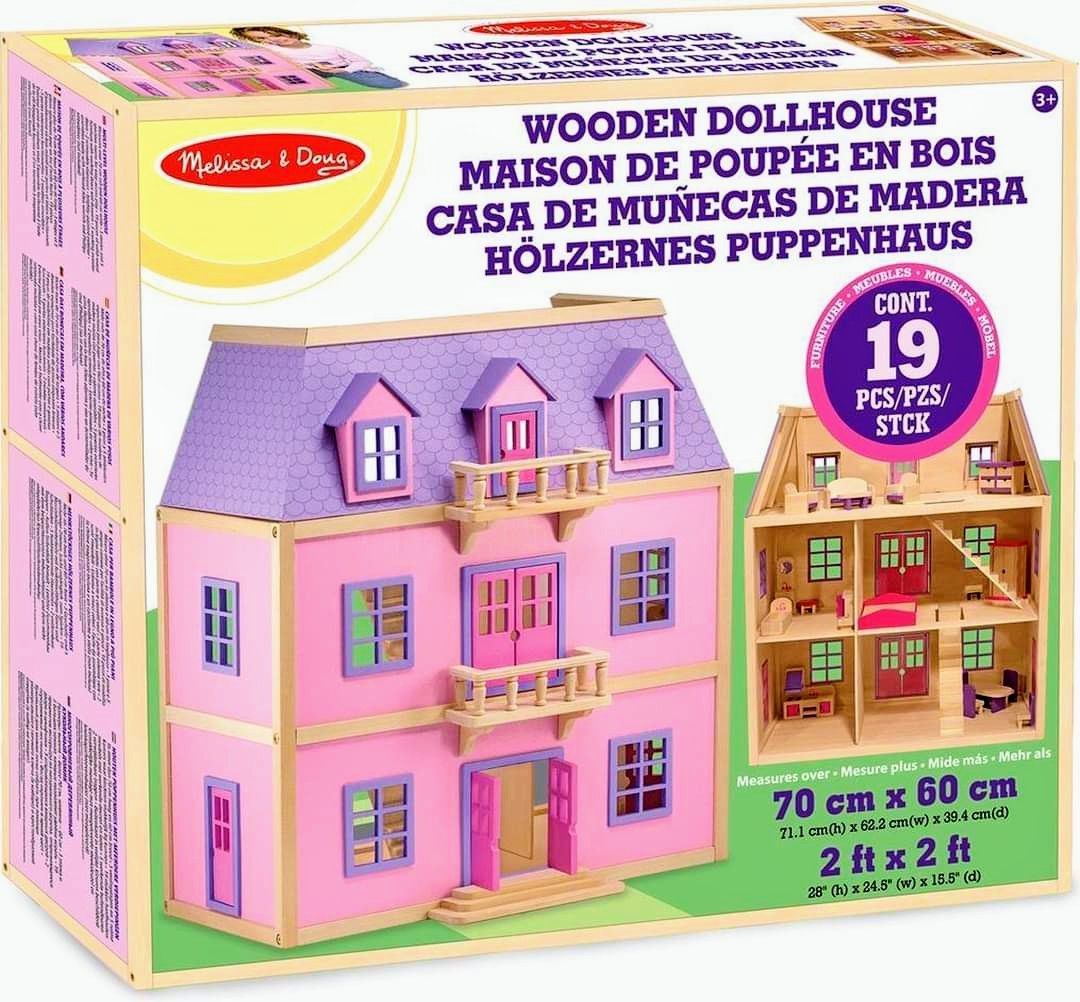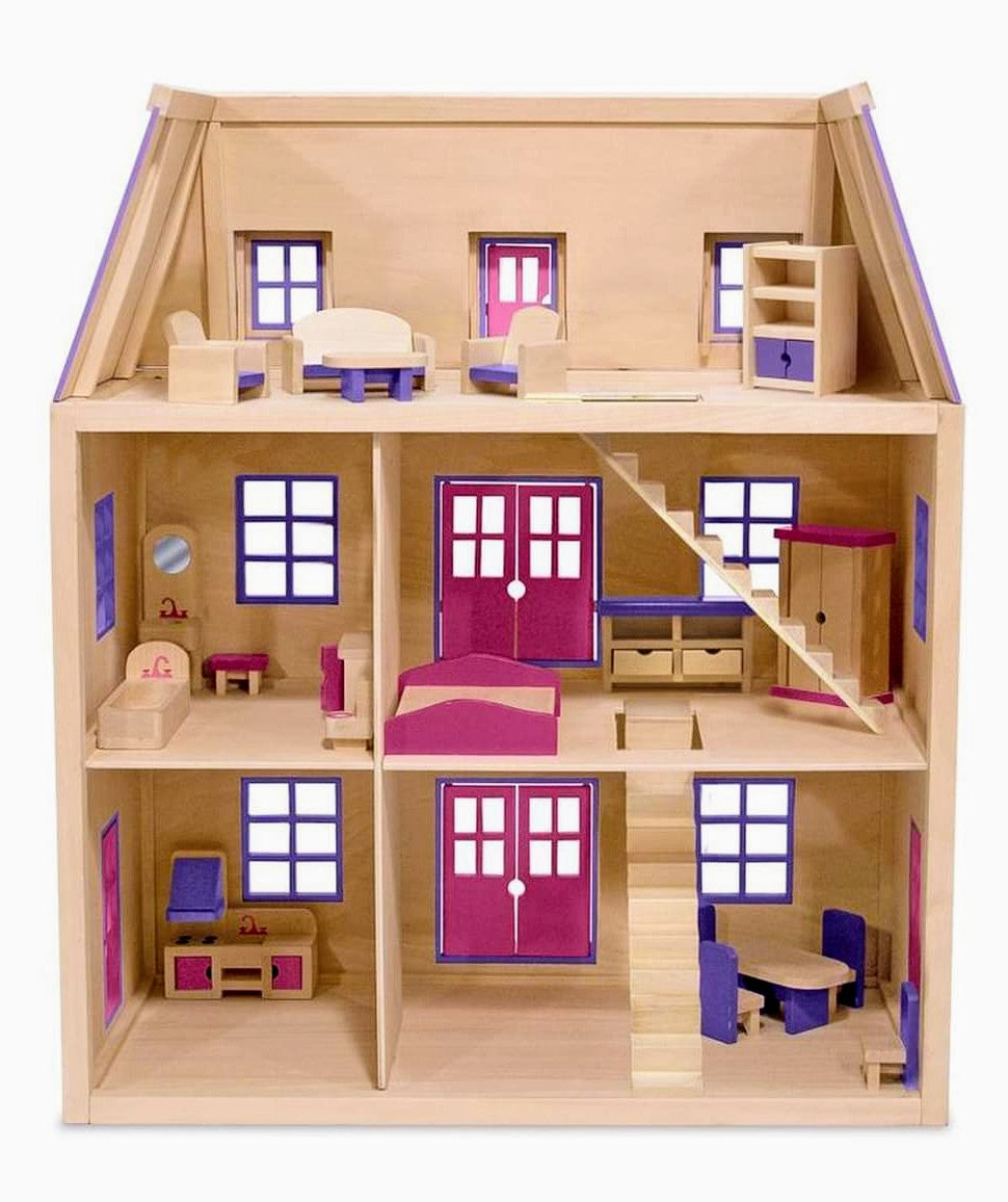 Houten poppenhuis met 3 verdiepingen van het merk Melissa & Doug. Met 2 verwijderbare trappen en 5 werkende deuren. Compleet met 19 meubels