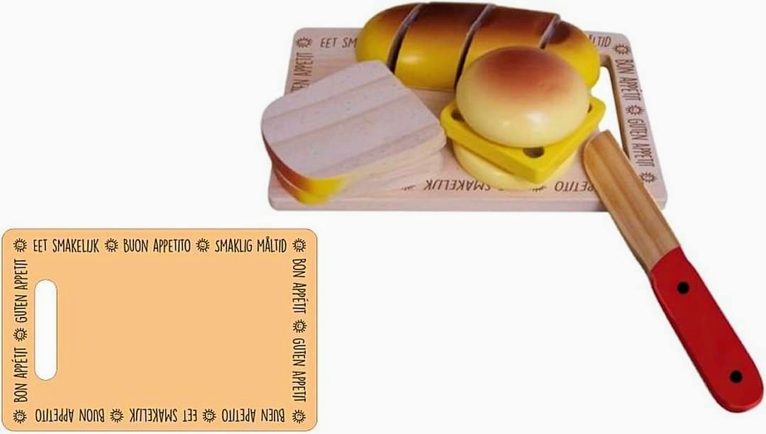 Brood-snij plankje, met leuke tekst op het plankje. Het brood zit aan elkaar met klittenband en kan worden doorgesneden met het meegeleverde houten mesje.