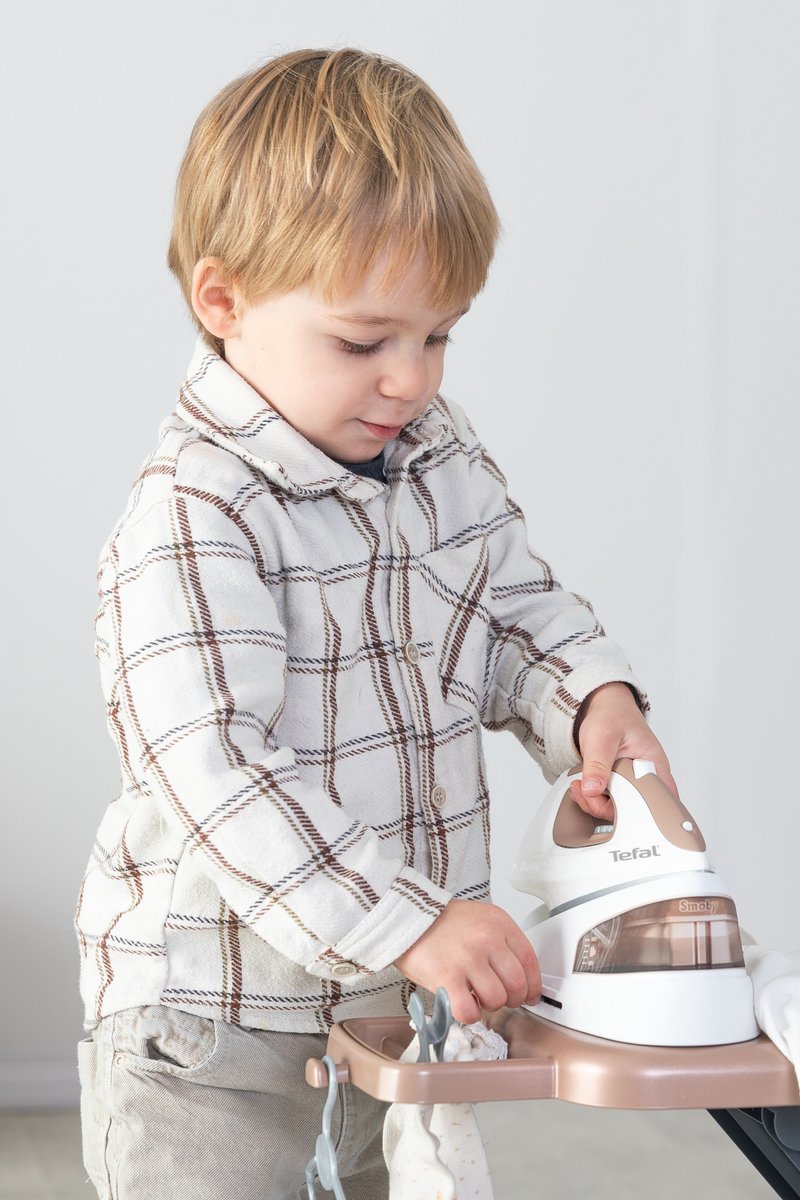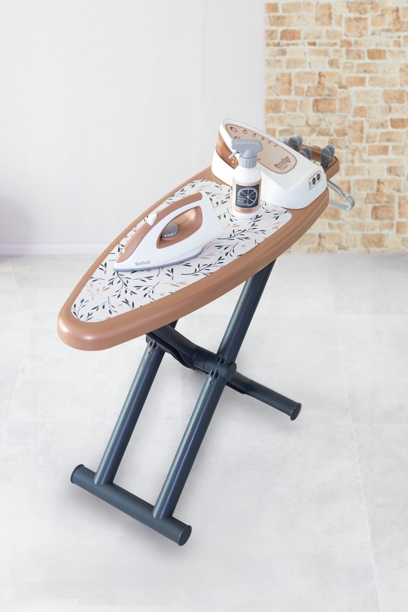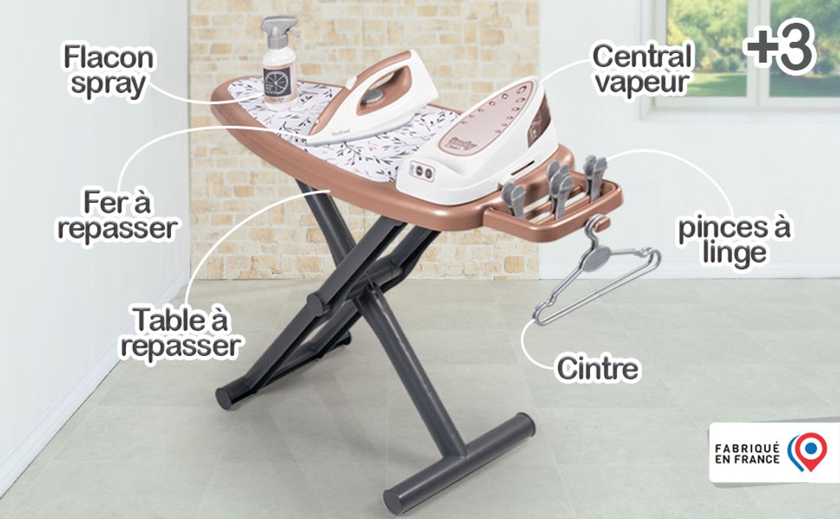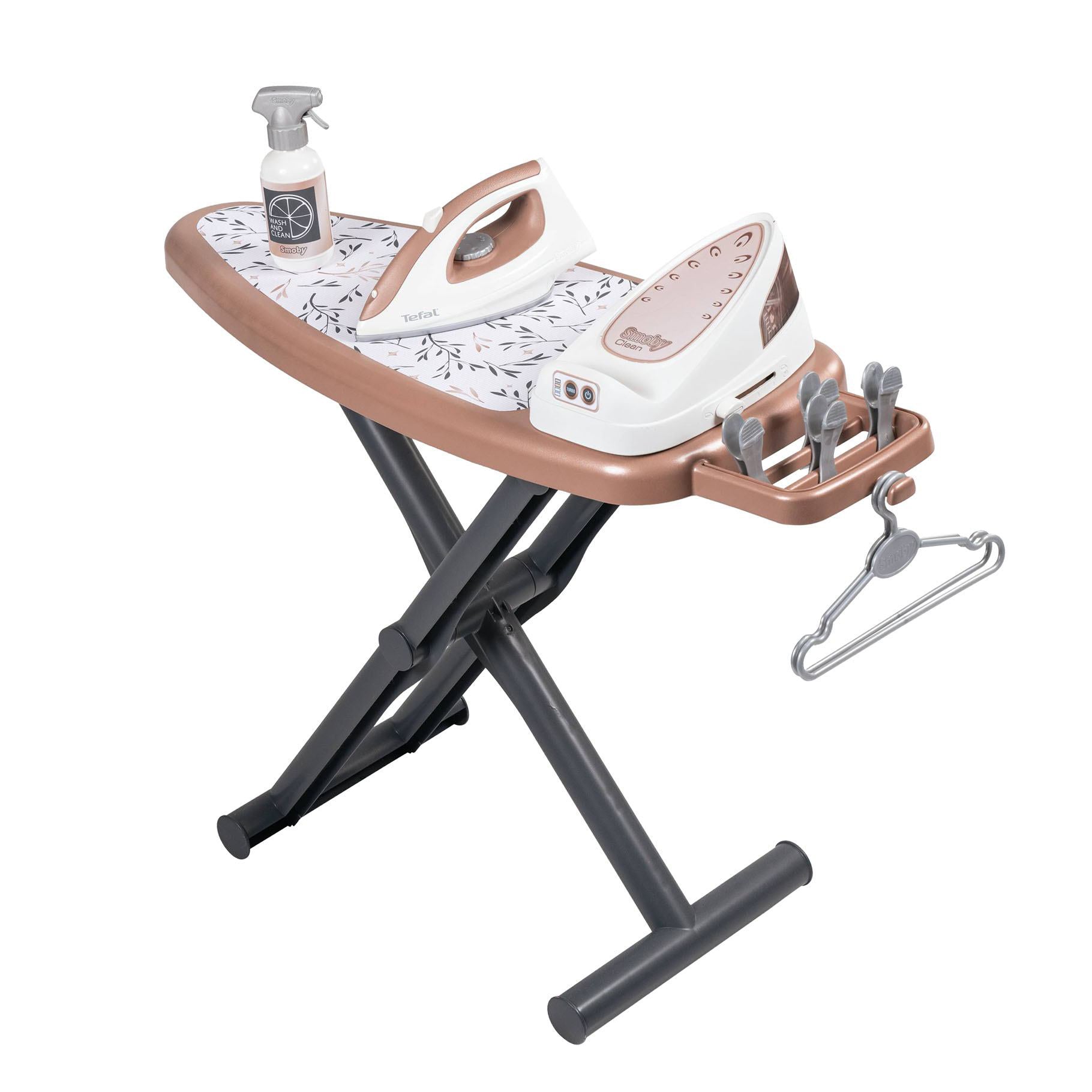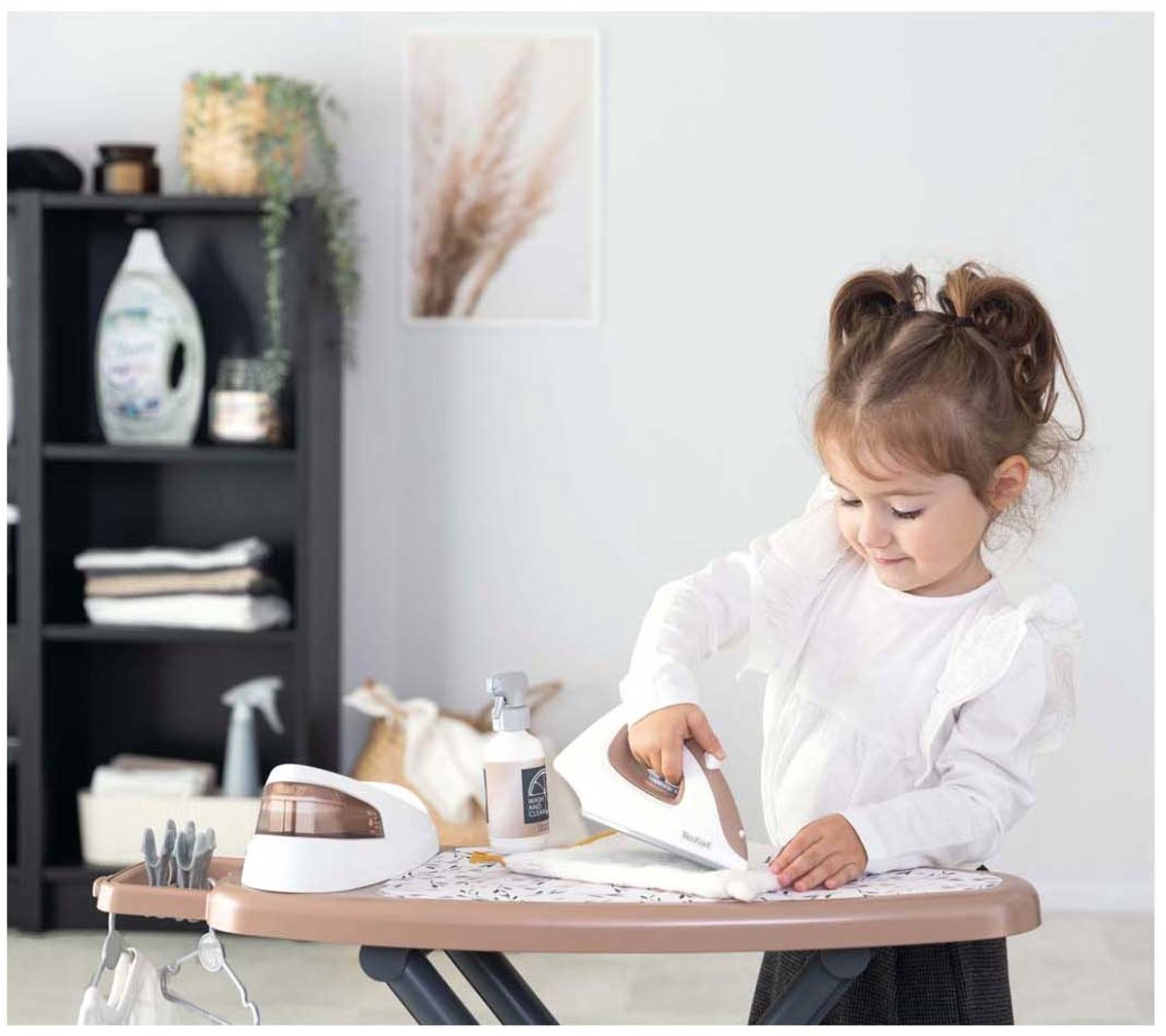 Met een speelgoed Stoomstrijkijzer en basis station, kleding hangers, knijpers en een ''spray''-fles.